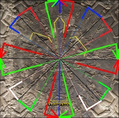 i due piccoli simboli triangolari posti sulle due orbite colorate giallo e verdino,rappresentano zolfo e mercurio che contornano la figura centrale esagonale CHAOS